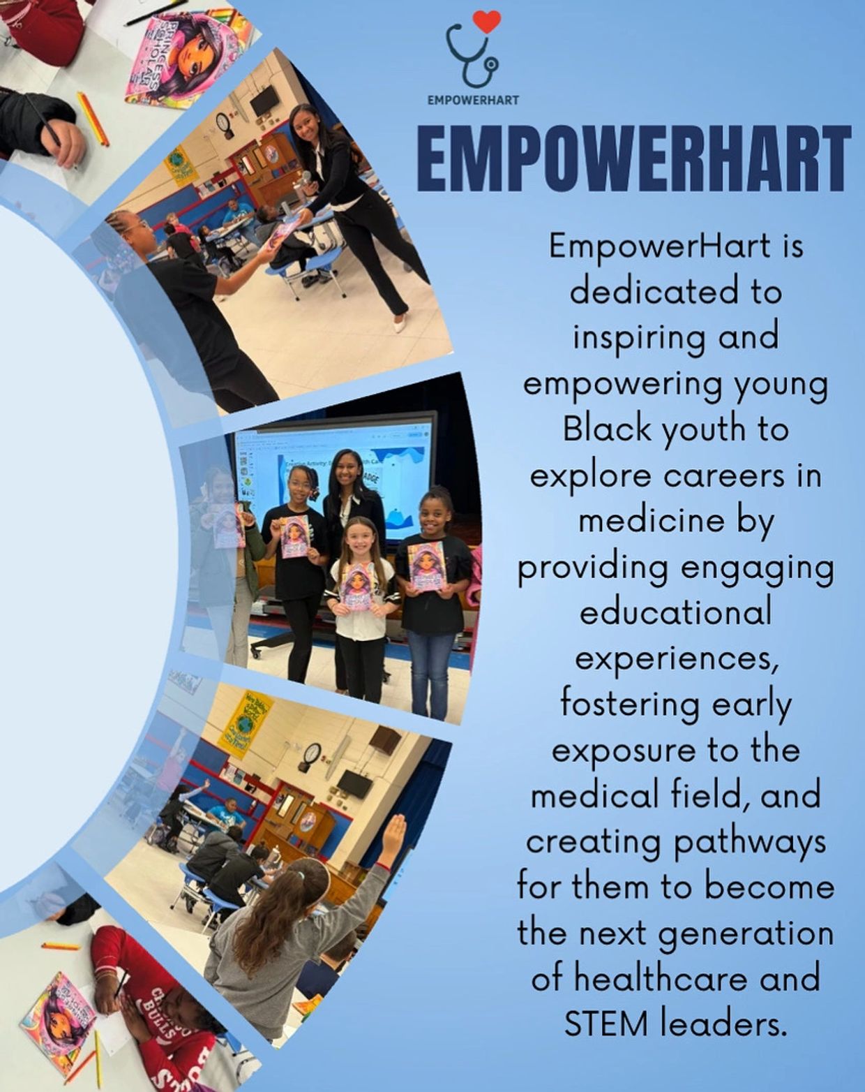 EmpowerHart is an educational and career exploration program dedicated to inspiring and empowering young Black women to pursue careers in medicine, healthcare, and STEM. Our program was created to address the lack of representation and access to opportunities for young Black women in the medical field by providing early exposure, mentorship, and hands-on learning experiences.